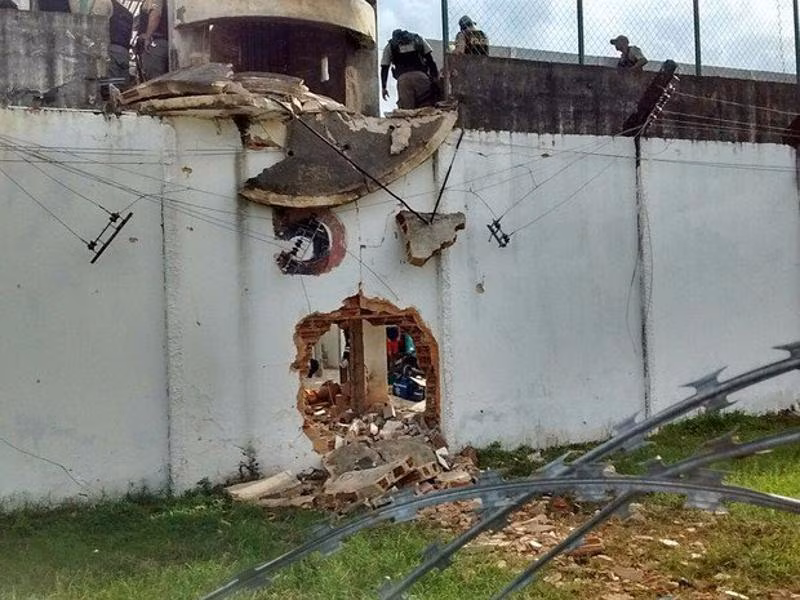 The prisoners use dynamite to blast through the prison wall, and they escaped through the gaping hole that resulted.